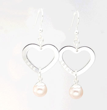 Vackra hjärtformade örhängen med plats för två namn eller ord per örhänge. Örhängena är gjorda helt i silver och är nickelfria. Under hjärtat hänger en äkta pärla, vilken kan fås i färgerna vitt, rosa eller lila.