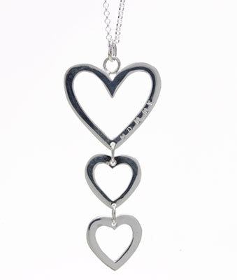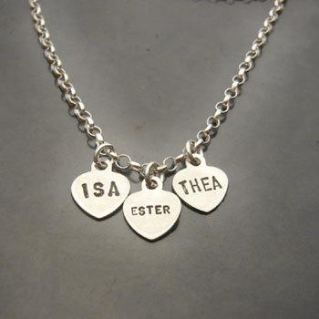 Halsband med tre små silverhjärtan på rad (10 x 10 mm), där du kan få valfri skrift med bokstäver som är 2 x 1 mm höga. Kommer med sk ärtkedja som är 40 cm lång.
