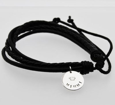 Betty Design gör detta fina armband i flätat konstläder med en eller flera berlocker med möjlighet att gravera namn.