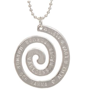 En stor silverpläterad spiral med plats för en längre text, max 65 tecken. Du kan även få symboler i form av hjärta eller stjärna på spiralen.