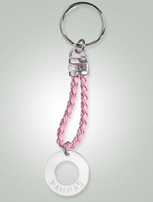 Fin, stilren nyckelring med bricka och detaljer i äkta silver. Välj mellan den handstämplade texten MAMMAS på framsidan, eller egen text mot pristillägg. Flätade rosa läderdetaljer.