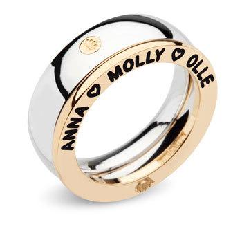 Lite mer exklusiva namnsmycken kommer från Hand Sweden. Här Family Wilmer, en slät vitguldsring med handemblem som går att gravera på sidan, kombinerad med en familyring av rödguld.