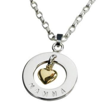 Vackert silverhalsband med 18-karats guldhjärta. Finns även i en större variant med plats för 3 namn. Smycket heter My family.