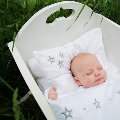 Hos Medveten Mini hittar du det bästa för barnets hud, helt fritt från hälsoskadliga ämnen. Det här ekologiska bäddsetet från Summerville i tre delar, Silver Star, är i 100% ekologisk GOTS-certifierad bomullssatin. Både påslakan och örngott har brodyr och är förpackade i vackra presentförpackningar. Passar fint som dopgåva.