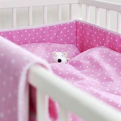 Rosaprickigt bäddset från Färg & Form som finns för vagn och vagga, spjälsäng och vuxensäng. finns i många fler färger som grått, rött, blått och grönt.