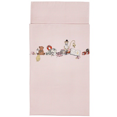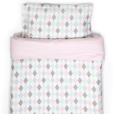 Påslakanset för spjälsäng från NG Baby. Mönstret heter Harlequin, ett lekfullt mönster och mjuka rosa pasteller. Bäddsetet finns även i en pastellblå variant samt i storlek för vagn/vagga. Örngott och påslakan är av 100% bomull.