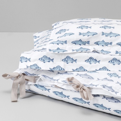 Designern Susann Karlsson Nemirovsky på Garbo & Friends har skapat ett underbart mönster med Sveriges fiskevattens mest vanliga fiskar – gädda, abborre, regnbågsforell och sill. Garbo & Friends sängkläder är av 100% bomull och finns för både vagga och spjälsäng. Titta in hos Lekmer.se för ett urval sängkläder i olika mönster, för såväl vagga som spjälsäng.