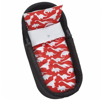 Rätt Start har påslakanset i 100% bomull både för vagn/vagga och för spjälsäng. Det här nya, fina motivet med dinosaurier finns även i grå, grön och blå färg.