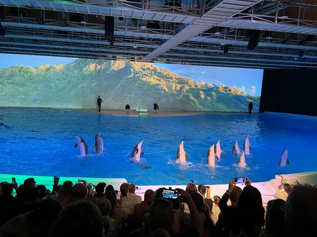 Delfiner i luften. Tränare som dansar med djuren i ett samspel som ser omöjligt ut. Musik. Ljus. Vattenstänk som når upp till sista raden. Barn som skriker av glädje. Föräldrar som glömmer att filma för att de är för förundrade.