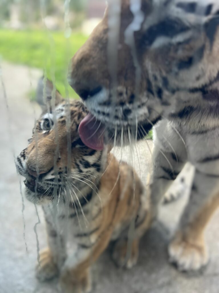 Den lilla tigerungen – med tungspetsen ute, ögonen stora som tallrikar, tassar som ännu inte riktigt vet vad de ska göra med sig – tryckte nosen mot glaset precis framför oss. Mamma stod bredvid. Stolt. Enorm. Helt oberörd av att ett gäng häpna människor stirrade med öppen mun på andra sidan.
