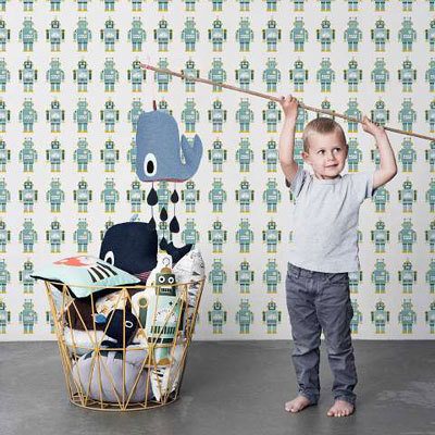 Glada robotar över hela väggen kan du få med den här tapeten från Ferm Living.