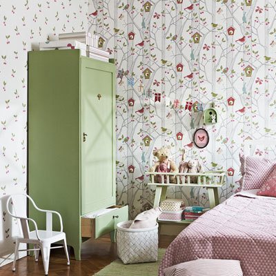 Tapetkollektionen Lilleby från Boråstapeter innehåller bland annat den här härliga skogstapeten full av fåglar och fjärilar.