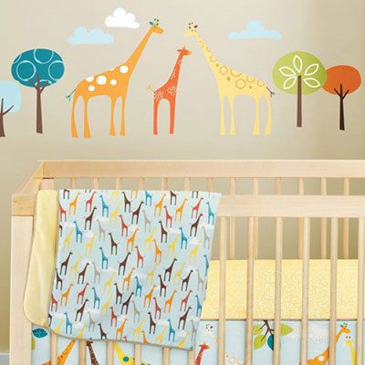 Varje set med väggdekaler består av 60 dekaler, varav 6 giraffer och åtta träd som du själv placerar i önskat mönster.