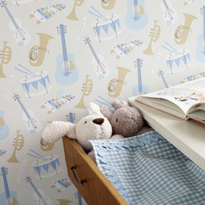 Tapeten Anders från Sandberg Tyg & Tapet består av virvlande musikinstrument.