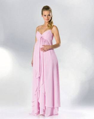 Det här är en brudklänning för dig som är gravid i vacker chiffong. Denna mammaklänning har smyckats med strass och mönster på bysten. Du kan välja mellan dragkedja eller snörning i ryggen på din mammaklänning. Modellen heter DBMA4 och finns i många olika färger.