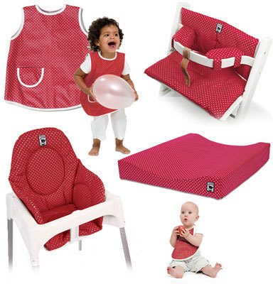 Nu kompletterar Polkadot design sitt utbud med en röd serie. Rött hittar du på haklappar, lekklänningar, stolsdynor och på skötbäddar.
