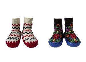Mocklis kommer med nya, fina mönster på sina mockasiner. Mockasiner är svensktillverkade med extra hög mudd i bomull och skinn. Kan tvättas i 40 grader. Här ses mockasinerna Kurbits och Rally Red.