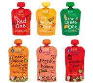 Brittiska Ella’s Kitchen börjar bli en eko-klassiker, mycket tack vara de fina och praktiska förpackningarna. Kan ätas både varma och kalla och enkelt återförslutas. Här syns ekologisk fruktpuréer, som passar för barn från 4 mån och uppåt. Pris: ca 25 kr Mer info om var du kan köpa produkten.