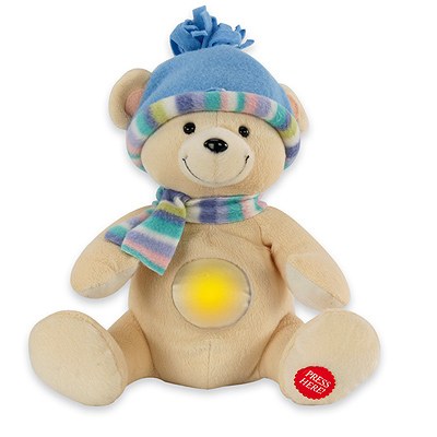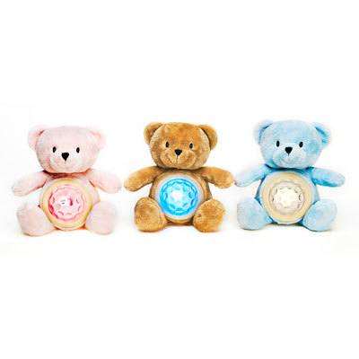 Tryck en gång på nallens mage så skiner en ljus stjärnhimmel över rummet. Tryck en gång till och stjärnorna växlar i färg från rött, blått till grönt.