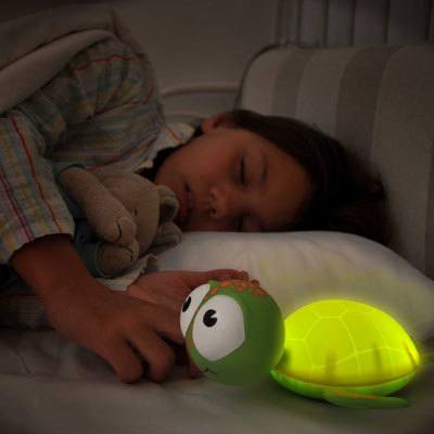 Med ett enkelt tryck på skalet så tänder du nattlampan sköldpaddan Gus från Baby Zoo.