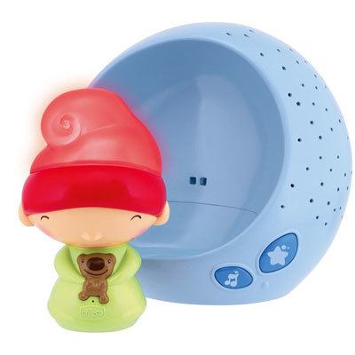 Nattlampan Good night baby från Chicco består av två delar, en bas som fungerar som högtalare och ljusprojektor samt en löstagbar liten alf med nattlampa i hatten.