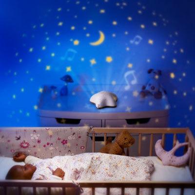 I basenheten kan du spela upp melodier och ha ett ljusspel på väggar och tak i barnrummet som ska lugna barnet.