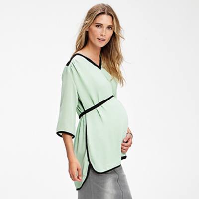 V-ringad mammablus i chiffong med trekvartslång ärm och kontrasterande färg i svart på halsringning, ärmslut, i sidorna och den nedre fållen. Blusen kommer med ett avtagbart bälte och bärs snyggt både med eller utan. Modellen heter Sara och kommer från Mama-Licious.