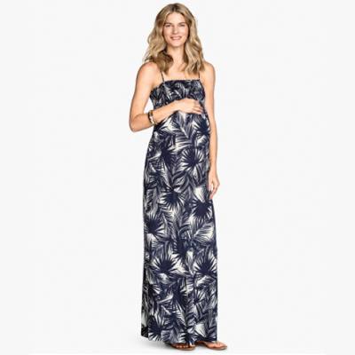 En lång klänning i trikå med tryckt mönster från H&M MAMA. Klänningen har smala axelband och smock upptill. Titta in hos H&M för mer mönstrade mammakläder till vår och sommar.